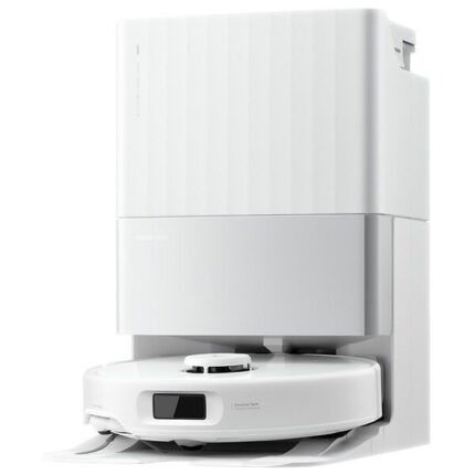 Robot aspirateur avec contrôle vocal, retour automatique à sa base de chargement, Wi-Fi intégré, vidage automatique et fonction serpillère, tout en restant silencieux (~60 dB) pour un nettoyage efficace sans bruit excessif.