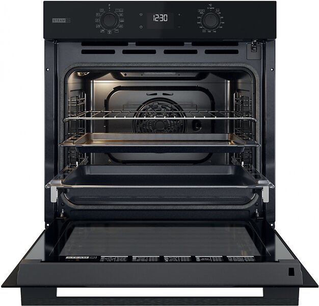 Four encastrable Whirlpool avec fonction vaporisation et rails télescopiques, facilitant des cuissons juteuses et un accès aisé aux plats.